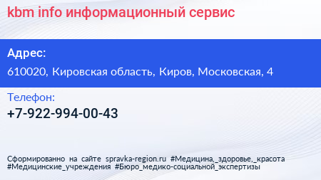 kbm.info, информационный сервис по адресу 610020, Кировская область, Киров, Московская, 4 в дальнейшем Организация, размещена в следующих категориях: