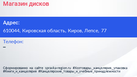 Магазин дисков по адресу 610044, Кировская область, Киров, Лепсе, 77 в дальнейшем Организация, размещена в следующих категориях: