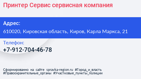 Принтер Сервис, сервисная компания по адресу 610020, Кировская область, Киров, Карла Маркса, 21 в дальнейшем Организация, размещена в следующих категориях: