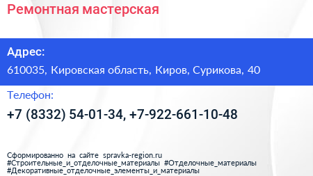 Ремонтная мастерская по адресу 610035, Кировская область, Киров, Сурикова, 40 в дальнейшем Организация, размещена в следующих категориях: