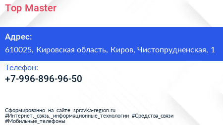 Top Master по адресу 610025, Кировская область, Киров, Чистопрудненская, 1 в дальнейшем Организация, размещена в следующих категориях: