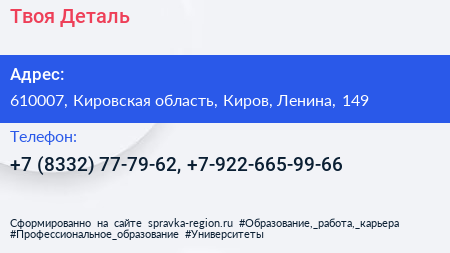 Твоя Деталь по адресу 610007, Кировская область, Киров, Ленина, 149 в дальнейшем Организация, размещена в следующих категориях: