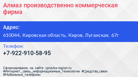 Алмаз, производственно-коммерческая фирма по адресу 610044, Кировская область, Киров, Луганская, 67г в дальнейшем Организация, размещена в следующих категориях: