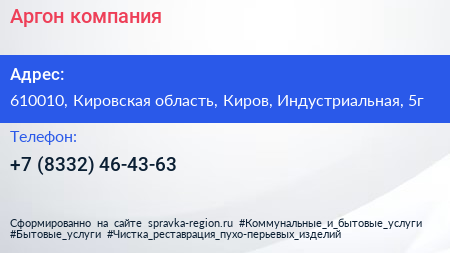 Аргон, компания по адресу 610010, Кировская область, Киров, Индустриальная, 5г в дальнейшем Организация, размещена в следующих категориях: