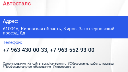 Автостэлс по адресу 610046, Кировская область, Киров, Заготзерновский проезд, 8д в дальнейшем Организация, размещена в следующих категориях: