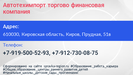 Автотехимпорт, торгово-финансовая компания по адресу 610030, Кировская область, Киров, Прудная, 51в в дальнейшем Организация, размещена в следующих категориях: