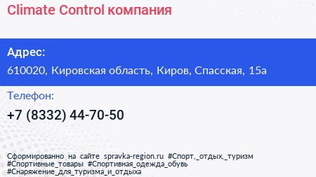 Climate Control, компания по адресу 610020, Кировская область, Киров, Спасская, 15а в дальнейшем Организация, размещена в следующих категориях: