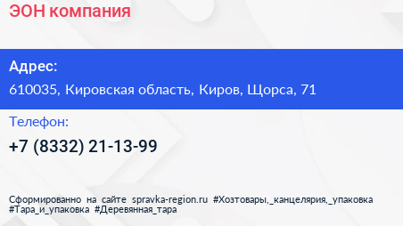 ЭОН, компания по адресу 610035, Кировская область, Киров, Щорса, 71 в дальнейшем Организация, размещена в следующих категориях: