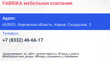 FABRIKA, мебельная компания по адресу 610035, Кировская область, Киров, Складская, 3 в дальнейшем Организация, размещена в следующих категориях: