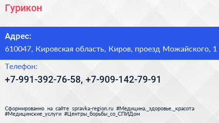 Гурикон по адресу 610047, Кировская область, Киров, проезд Можайского, 1 в дальнейшем Организация, размещена в следующих категориях: