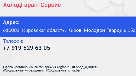 ХолодГарантСервис по адресу 610002, Кировская область, Киров, Молодой Гвардии, 15а в дальнейшем Организация, размещена в следующих категориях: