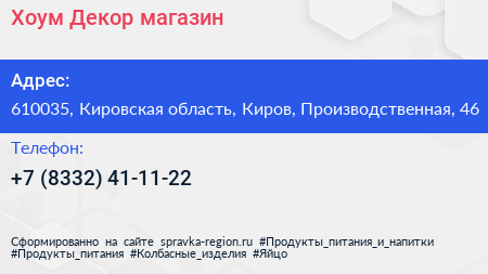 Хоум Декор, магазин по адресу 610035, Кировская область, Киров, Производственная, 46 в дальнейшем Организация, размещена в следующих категориях: