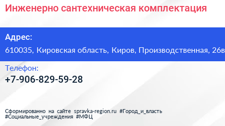 Инженерно-сантехническая комплектация по адресу 610035, Кировская область, Киров, Производственная, 26в в дальнейшем Организация, размещена в следующих категориях: