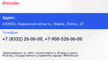 Инлайн по адресу 610042, Кировская область, Киров, Лепсе, 27 в дальнейшем Организация, размещена в следующих категориях: