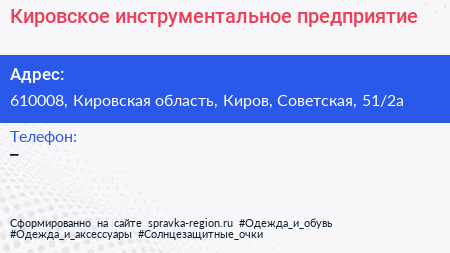 Кировское инструментальное предприятие по адресу 610008, Кировская область, Киров, Советская, 51/2а в дальнейшем Организация, размещена в следующих категориях: