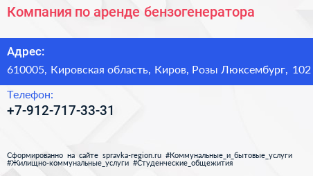Компания по аренде бензогенератора по адресу 610005, Кировская область, Киров, Розы Люксембург, 102 в дальнейшем Организация, размещена в следующих категориях:
