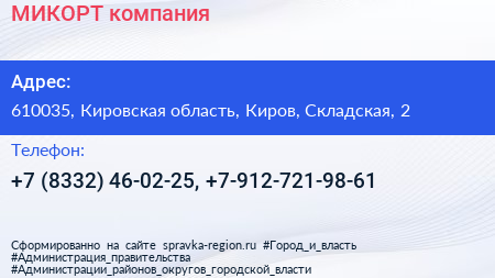 МИКОРТ, компания по адресу 610035, Кировская область, Киров, Складская, 2 в дальнейшем Организация, размещена в следующих категориях: