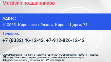 Магазин подшипников по адресу 610035, Кировская область, Киров, Щорса, 71 в дальнейшем Организация, размещена в следующих категориях: