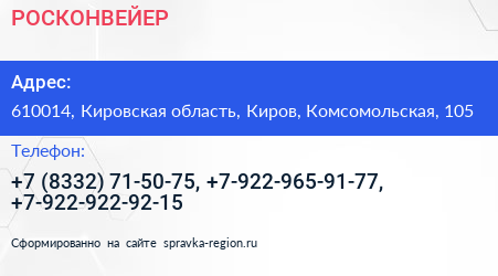 РОСКОНВЕЙЕР по адресу 610014, Кировская область, Киров, Комсомольская, 105 в дальнейшем Организация, размещена в следующих категориях: