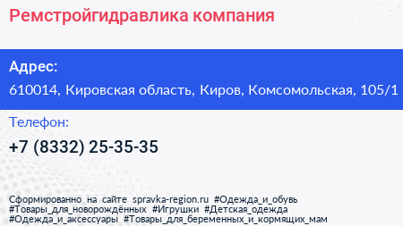Ремстройгидравлика, компания по адресу 610014, Кировская область, Киров, Комсомольская, 105/1 в дальнейшем Организация, размещена в следующих категориях: