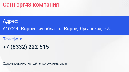 СанТорг43, компания по адресу 610044, Кировская область, Киров, Луганская, 57а в дальнейшем Организация, размещена в следующих категориях: