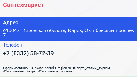 Сантехмаркет по адресу 610047, Кировская область, Киров, Октябрьский проспект, 7 в дальнейшем Организация, размещена в следующих категориях: