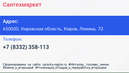 Сантехмаркет по адресу 610020, Кировская область, Киров, Ленина, 72 в дальнейшем Организация, размещена в следующих категориях: