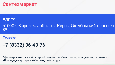 Сантехмаркет по адресу 610005, Кировская область, Киров, Октябрьский проспект, 89 в дальнейшем Организация, размещена в следующих категориях: