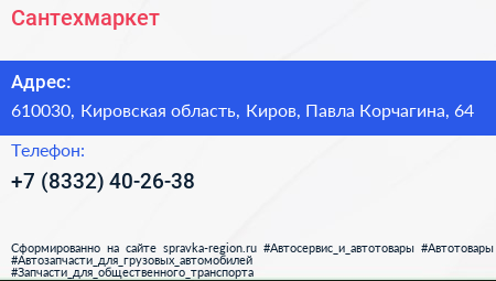 Сантехмаркет по адресу 610030, Кировская область, Киров, Павла Корчагина, 64 в дальнейшем Организация, размещена в следующих категориях: