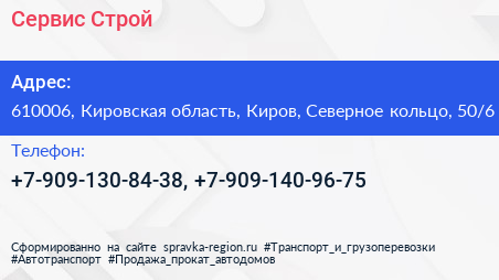 Сервис Строй по адресу 610006, Кировская область, Киров, Северное кольцо, 50/6 в дальнейшем Организация, размещена в следующих категориях: