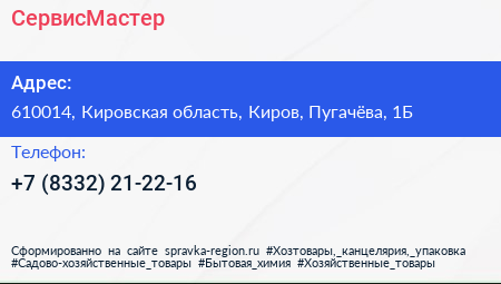 СервисМастер по адресу 610014, Кировская область, Киров, Пугачёва, 1Б в дальнейшем Организация, размещена в следующих категориях:
