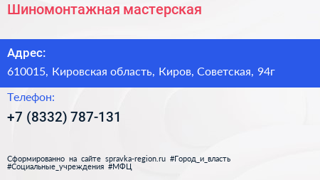 Шиномонтажная мастерская по адресу 610015, Кировская область, Киров, Советская, 94г в дальнейшем Организация, размещена в следующих категориях:
