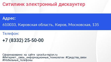 Ситилинк, электронный дискаунтер по адресу 610033, Кировская область, Киров, Московская, 135 в дальнейшем Организация, размещена в следующих категориях:
