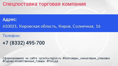 Спецпоставка, торговая компания по адресу 610021, Кировская область, Киров, Солнечная, 16 в дальнейшем Организация, размещена в следующих категориях: