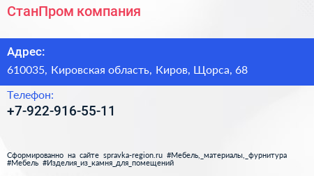 СтанПром, компания по адресу 610035, Кировская область, Киров, Щорса, 68 в дальнейшем Организация, размещена в следующих категориях: