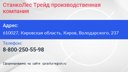 СтанкоЛес-Трейд, производственная компания по адресу 610027, Кировская область, Киров, Володарского, 237 в дальнейшем Организация, размещена в следующих категориях: