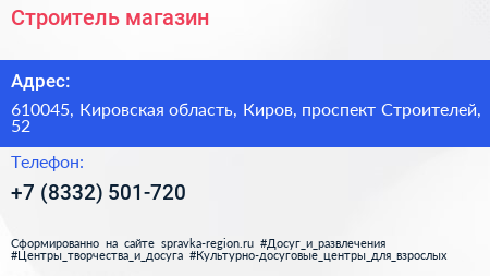 Строитель, магазин по адресу 610045, Кировская область, Киров, проспект Строителей, 52 в дальнейшем Организация, размещена в следующих категориях: