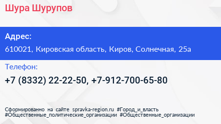 Шура Шурупов по адресу 610021, Кировская область, Киров, Солнечная, 25а в дальнейшем Организация, размещена в следующих категориях: