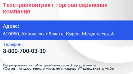 Техстройконтракт, торгово-сервисная компания по адресу 610050, Кировская область, Киров, Менделеева, 6 в дальнейшем Организация, размещена в следующих категориях: