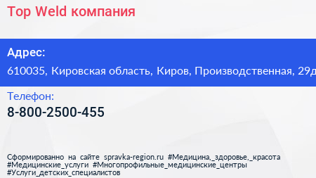 Top Weld, компания по адресу 610035, Кировская область, Киров, Производственная, 29д в дальнейшем Организация, размещена в следующих категориях: