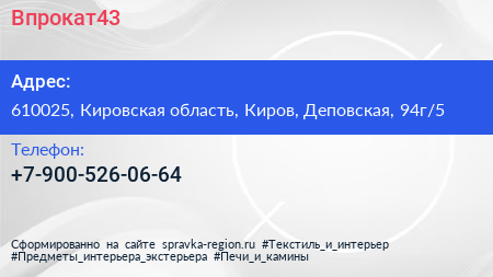Впрокат43 по адресу 610025, Кировская область, Киров, Деповская, 94г/5 в дальнейшем Организация, размещена в следующих категориях:
