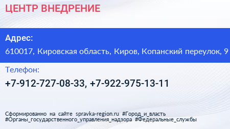 ЦЕНТР ВНЕДРЕНИЕ по адресу 610017, Кировская область, Киров, Копанский переулок, 9 в дальнейшем Организация, размещена в следующих категориях: