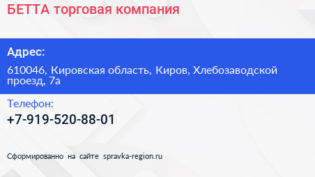 БЕТТА, торговая компания по адресу 610046, Кировская область, Киров, Хлебозаводской проезд, 7а в дальнейшем Организация, размещена в следующих категориях: