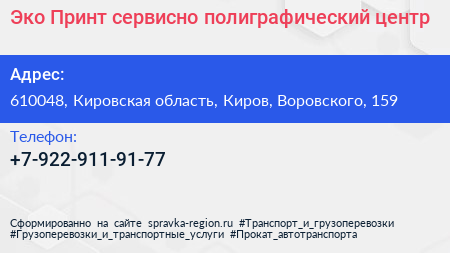 Эко Принт, сервисно-полиграфический центр по адресу 610048, Кировская область, Киров, Воровского, 159 в дальнейшем Организация, размещена в следующих категориях: