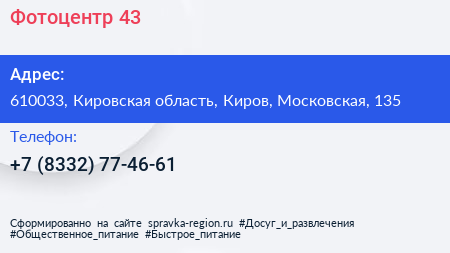 Фотоцентр 43 по адресу 610033, Кировская область, Киров, Московская, 135 в дальнейшем Организация, размещена в следующих категориях: