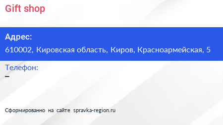 Gift shop по адресу 610002, Кировская область, Киров, Красноармейская, 5 в дальнейшем Организация, размещена в следующих категориях: