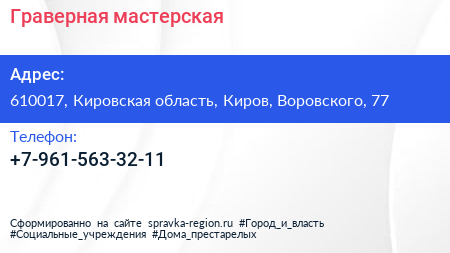 Граверная мастерская по адресу 610017, Кировская область, Киров, Воровского, 77 в дальнейшем Организация, размещена в следующих категориях: