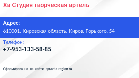 Ха! Студия, творческая артель по адресу 610001, Кировская область, Киров, Горького, 54 в дальнейшем Организация, размещена в следующих категориях: