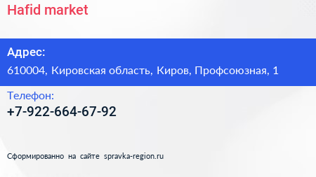 Hafid.market по адресу 610004, Кировская область, Киров, Профсоюзная, 1 в дальнейшем Организация, размещена в следующих категориях: