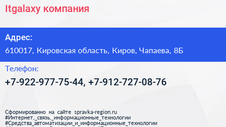 Itgalaxy, компания по адресу 610017, Кировская область, Киров, Чапаева, 8Б в дальнейшем Организация, размещена в следующих категориях: